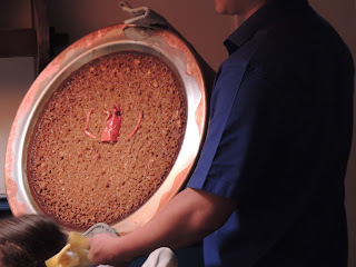 Paul thought any paella looks and tastes better with him in the picture. Maybe he's right? This gives you a really nice look at Norberto's copper specialty pans. He heats the paella over an open fire in the kitchen and this shows that it is thick and doesn't fall out of the pan. Mine does :(.Oh well.